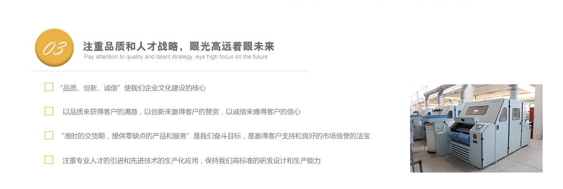太倉市高陽工貿(mào)有限公司是專業(yè)從事特種紗生產(chǎn)十數(shù)年的一線生產(chǎn)廠家,坐落于江蘇省蘇州市太倉市雙鳳鎮(zhèn)新湖建湖路29號,太倉隸屬長江三角洲經(jīng)濟圈,交通便捷,經(jīng)濟發(fā)達,是著名的紡織生產(chǎn)基地。 公司歷史要追溯到1982年就成立的新湖毛紡織廠。1996年,毛紡織廠與上海二十二棉在新湖聯(lián)合組建了太倉市新湖福利綜合廠。2002年為適應市場的飛速變化,公司轉(zhuǎn)制重組更名為太倉市高陽工貿(mào)有限公司。同時公司適時調(diào)整生產(chǎn)經(jīng)營策略,調(diào)整產(chǎn)品品種結(jié)構(gòu),把生產(chǎn)特種紗作為主要發(fā)展方向,純棉、滌綸竹節(jié)紗是我們的主要產(chǎn)品。 公司多年來始終保持了持續(xù)穩(wěn)定發(fā)展的良好勢頭,在激烈的市場競爭中發(fā)展壯大,不斷前行。我們把“走品牌發(fā)展之路,創(chuàng)紗線知名商標”作為公司持續(xù)發(fā)展的核心戰(zhàn)略。以市場為導向,堅持“以品種求發(fā)展,以質(zhì)量求生存”的方針,以增強市場競爭力為中心,對不斷變化的市場環(huán)境作出快速反應,品牌戰(zhàn)略的實施。公司注重專業(yè)人才的引進和先進技術(shù)的生產(chǎn)化應用,具備較強的研發(fā)設計和生產(chǎn)能力。 公司一直把“品質(zhì)、創(chuàng)新、誠信”作為企業(yè)文化建設的核心。以品質(zhì)來獲得客戶的滿意,以創(chuàng)新來贏得客戶的贊賞,以誠信來博得客戶的信心。我們把“準時的交貨期,提供零缺點的產(chǎn)品和服務”作為奮斗目標,贏得了客戶的支持和良好的市場信譽。 高陽工貿(mào)有限公司愿與廣大客戶加強合作,共享信息,迎接挑戰(zhàn),共同發(fā)展。客戶需求。了解詳細>>